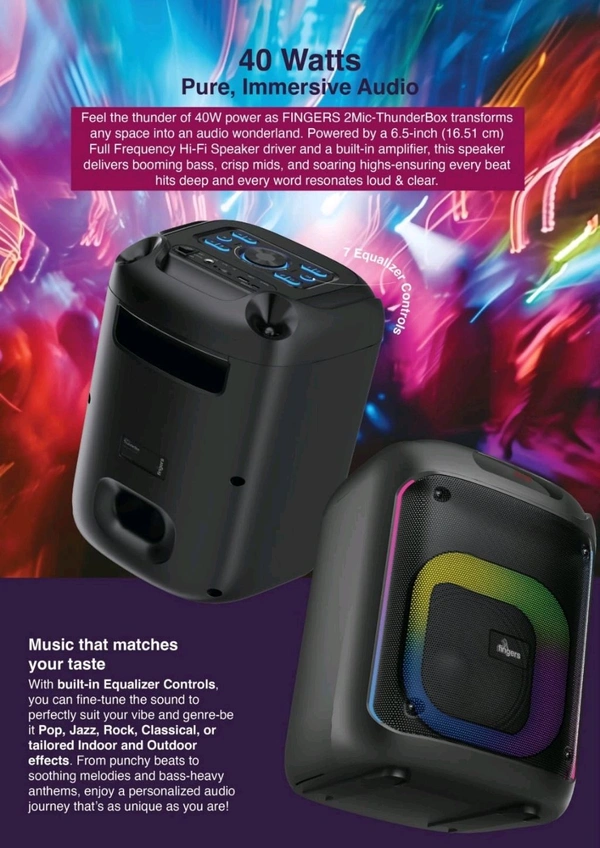 Why Choose FINGERS ThunderBox? Backed by the trusted brand FINGERS, this Bluetooth speaker is designed to deliver high-quality audio that meets the needs of music lovers, professionals, and entertainment seekers alike.
