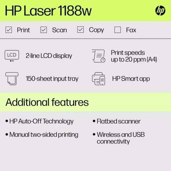 HP MFP M1188W एक बहुउद्देशीय, मोनोक्रोम लेजर प्रिंटर है जो प्रिंटिंग, स्कैनिंग और कॉपी करने के कार्यों को प्रदान करता है। यह वाई-फाई कनेक्टिविटी का समर्थन करता है, जिससे आप अपने उपकरणों से वायरलेस प्रिंट कर सकते हैं। यहां कुछ मुख्य विशेषताएं दी गई हैं:
